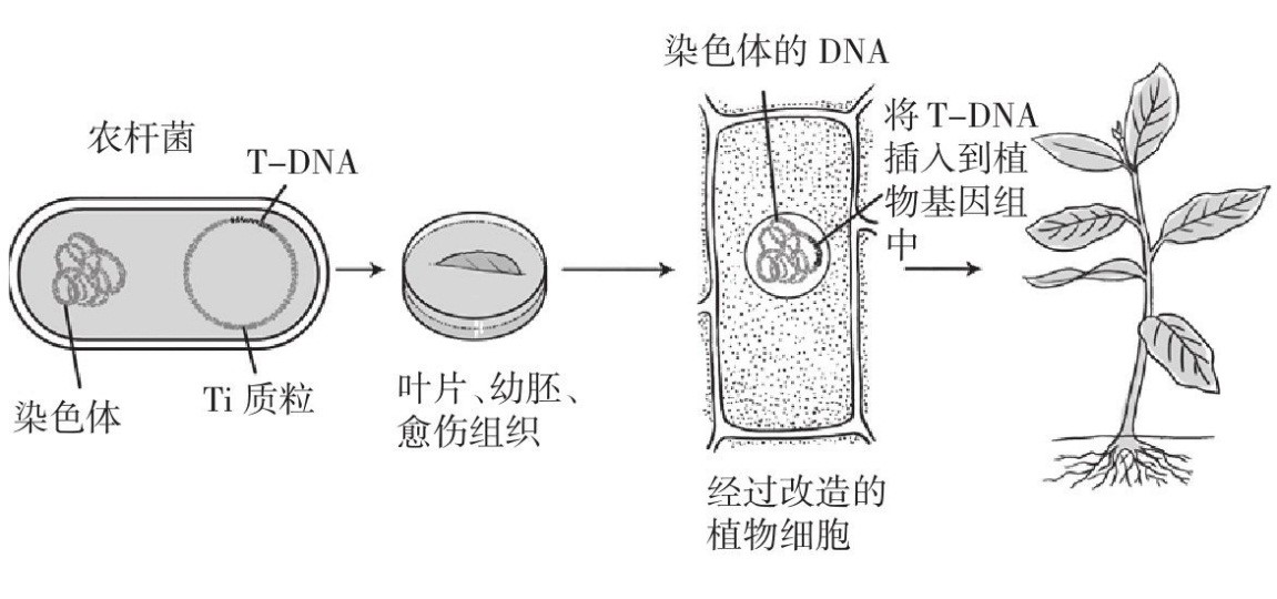 农杆菌(Agrobacterium)是普遍存在于土壤中的一种革兰氏阴性细菌,它能在自然条件下趋化性地感染大多数双子叶植物的受伤部位,并诱导产生冠瘿瘤或发状根[1]。土壤杆菌是常见的植物病原体,具有把它们的DNA片段转给植物的能力,这一属性已经被植物科学家用于制造转基因农作物,即基因修饰农作物[2, 3]。其中,根癌农杆菌(Agrobacterium tumefaciens)和发根农杆菌(Agrobacterium rhizogenes)细胞中分别含有Ti质粒和Ri质粒,其上有一段T-DNA,农杆菌通过侵染植物伤口进入细胞后,可将T-DNA插入到植物基因组中(图1)。因此,农杆菌是一种天然的植物遗传转化体系[4, 5]。