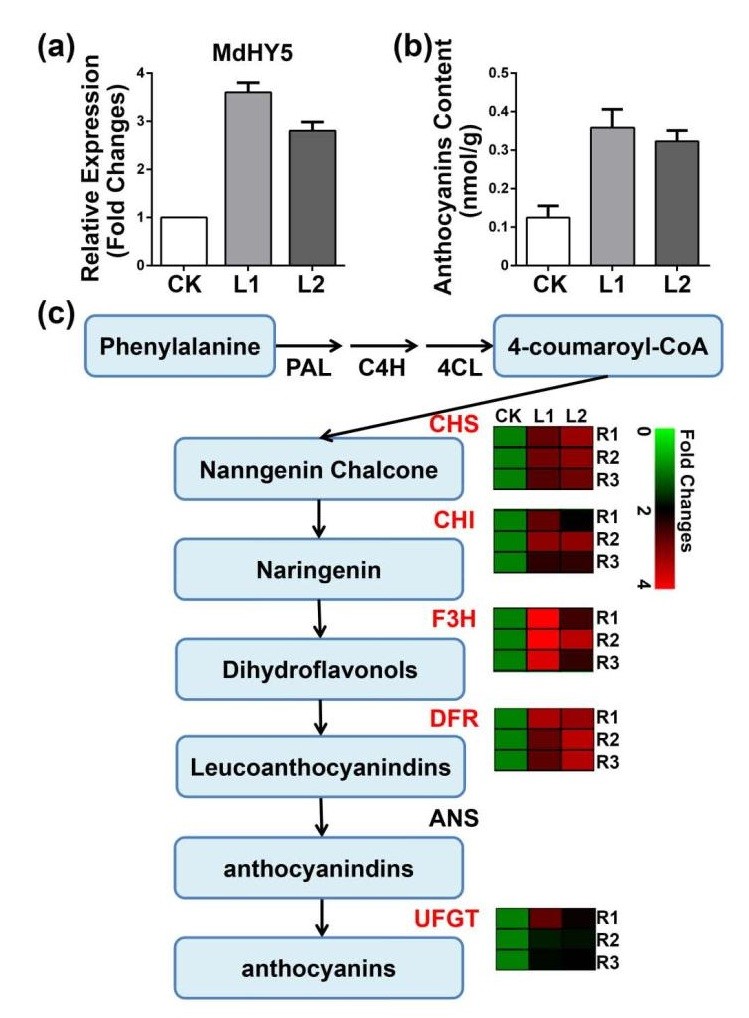 研究表明,MzHY5是一种bZIP转录因子,可调节苹果中的花青素合成[10]。本研究中采用了根转基因方法克隆了该基因并在'Gala'中过表达,在两个转基因品系中,MdHY5的表达水平增加2.5至3倍(图6)。为了证实MdHY5的作用,还使用RT-qPCR检测其花青素途径中的靶基因的表达水平,包括MdCHS、MdCHI、MdF3H、MdDFR、MdUFGT,发现这些基因的表达均被上调。这些结果表明,毛状根转基因系统可以成功地用于研究植物次生代谢,并提供一种简单快速的方法来验证基因在草本和木本植物中的功能。