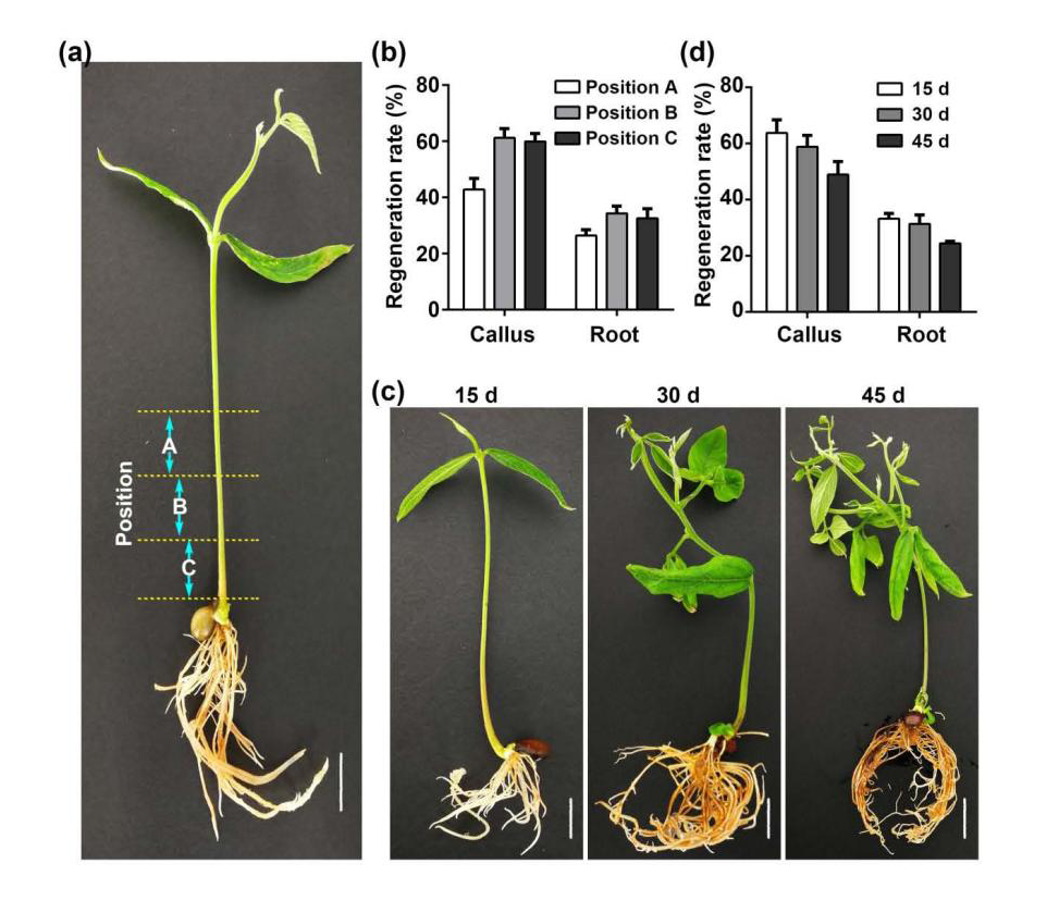 将靠近豌豆下胚轴的茎部分成三部分,每部分为0.5厘米。这些被部位从上到下分别命名为位置A、B和C(图3)。对于位置B和C,愈伤组织和毛状根的诱导率约为60%,而对于A则显着较低。使用三个不同年龄(15天,30天或45天)的幼苗来确定注射用幼苗的最佳年龄。结果表明,15日龄和30日龄幼苗的诱导率高于45日龄幼苗。