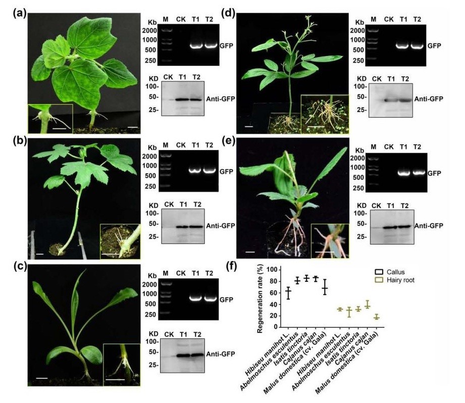 该研究进一步扩展到湖北海棠、亚洲海棠、Gala苹果,红花、决明子、板蓝根、金花葵、秋葵、蓖麻、锦鸡儿及白木香等木本和草本的经济及药用植物中(图4)。结果表明,除了决明子、蓖麻和白木香外,其它9种植物都成功产生了毛状根。毛状根再生率在15%-45%之间,愈伤组织再生率在16%-85%之间变化, RT-PCR和蛋白质印迹证实靶基因(GFP)在转基因发根中表达。这些结果表明毛状根方法具有从草药到木本植物的广泛应用范围。