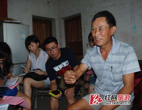 (村民朱自中(右一)向记者们详细介绍了株梅“抬故事”。)