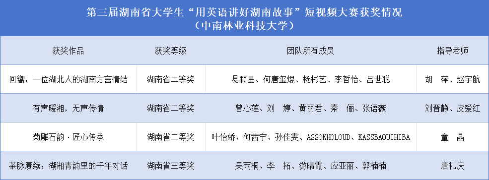 【林大网讯】(文/国际交流与合作处)近日,第三届湖南省大学生“用英语讲好湖南故事”短视频大赛获奖名单正式公布,我校参赛作品《回響:一位湖北人的湖南方言情结》《有声暖湘 无声传情》《菊雕石韵·匠心传承》荣获本科组二等奖,《茶脉赓续:湖湘青韵里的千年对话》荣获本科组三等奖。