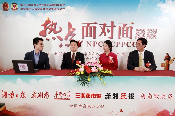 3月8日,朱道弘与长沙市副市长何寄华、湖南山河智能装备股份有限公司张晓庆这两位全国人大代表一起,做客两会“热点面对面”会客室,就相关话题进行交流。