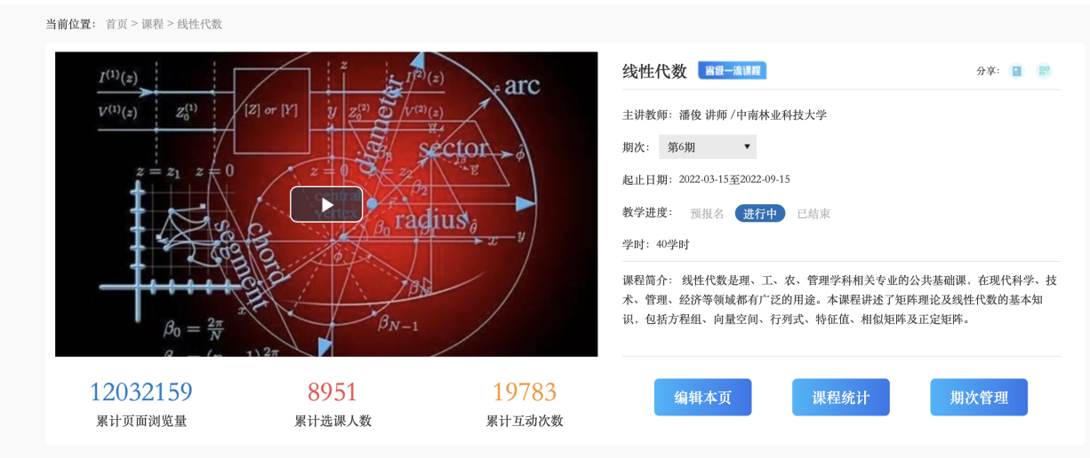 湖南省一流线上课程《线性代数》(图1)到底怎么样?网课到底是怎么上的?以潘俊老师为首的教学团队在本轮疫情防控中线上教学中做了很好的诠释与示范。全校共有80余个班级超过3000余学生选修《线性代数》,团队利用信息化技术开展教学改革与探索,丰富和完善了在线教学资源,采用线上+线下混合式教学模式和多元考核评价方法,取得了很好的教学效果,为保证线上教学质量发挥了重要作用。