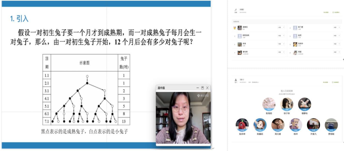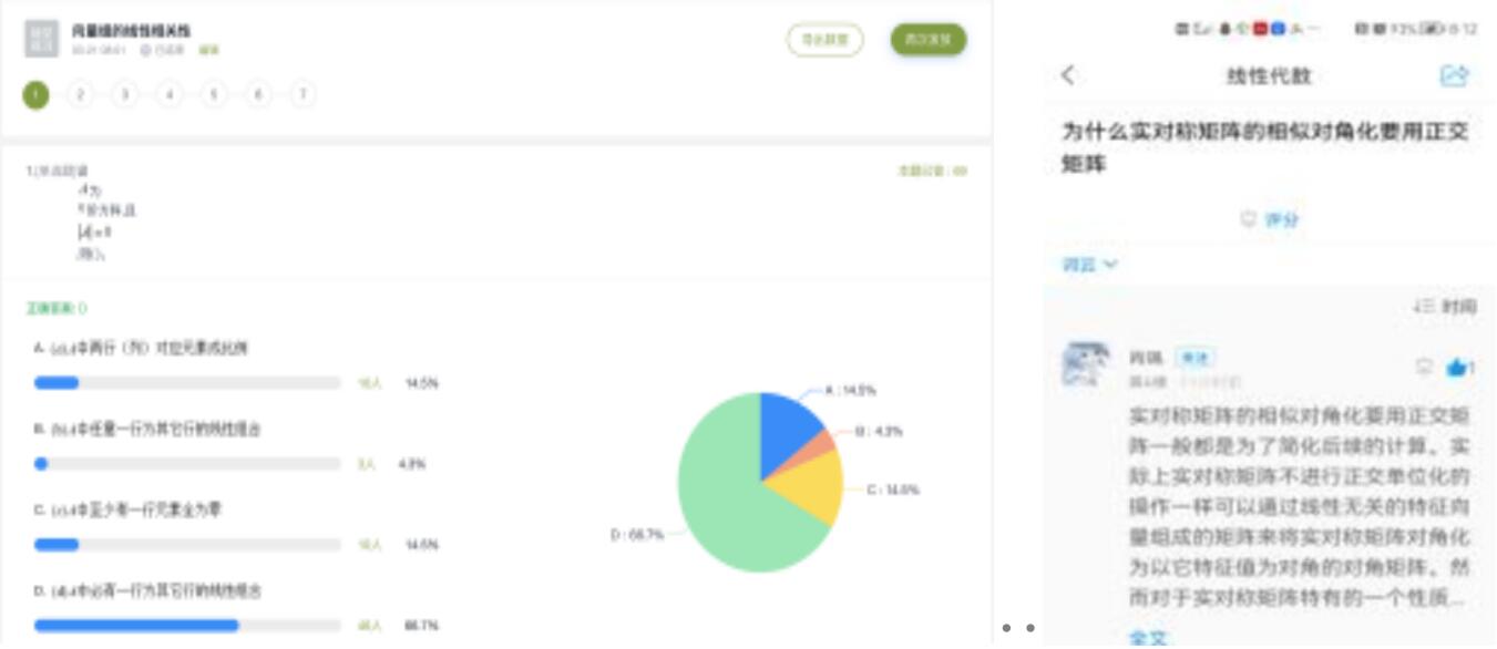 在潘俊老师的带领和组织下,先期对线上教学资源进行了充分完善,为直播课堂做足充分准备;丰富多样的选人、抢答、随堂测验、讨论等线上课堂活动,大大地激发了学生的学习兴趣(图2);在线答疑、课后作业和单元高阶测验等环节,强化了学生对知识的理解与运用。在团队共同努力下,《线性代数》课程的线上教学常常选用生活实例,授课者有声有色,听课者兴趣盎然。