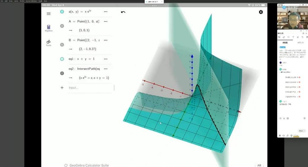 无论《线性代数》还是《高等数学》,对大一学生来说,这些数学类课程不但抽象难懂,对逻辑思维有一定要求,而且更强调板书的重要性,需要有条不紊地讲解各知识点。为了保证教学效果,承担这2门课教学的韩靖老师想方设法,使用视频采集卡将iPad屏幕稳定输出至电脑,在iPad上实现了手写板书(图4),既达到了黑板板书清晰直观的效果,又能利用电脑软件很好地辅助教学,使学生获得更好的虚拟课堂体验。上课时韩老师会主动打开教师端摄像头,拉近与同学间的距离,使用一些可视化手段演示数学概念的几何意义。例如在讲解应用实例时展示搜索引擎中常用的PageRank算法,在GeoGebra中演示方向导数(图5)等。通过各种方式使线上课堂生动有趣,激发同学们的学习兴趣。