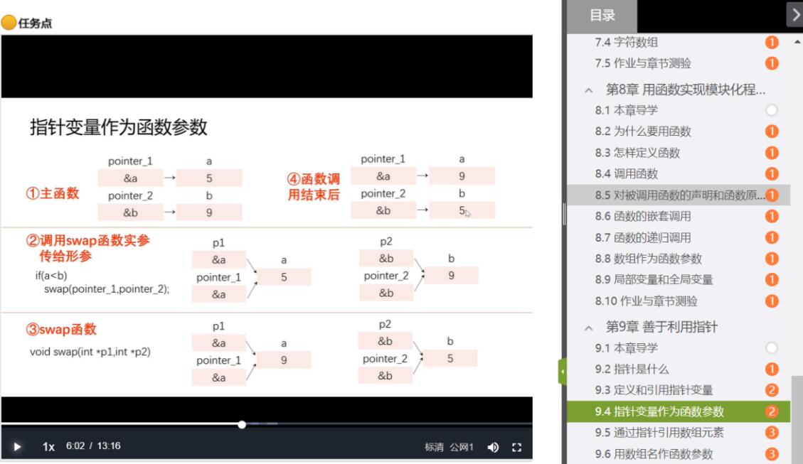 为了解决这个问题,她们做了三件事情:①绘制思维导图。本课程和每章导学都制作了思维导图(如图7),把各章知识点用相互隶属和相关的层级图表现出来,把重难点关键词与颜色等建立记忆链接。思维导图的建立有助于学生快速全面理清全书或章节的知识脉络,思考知识点之间的相互联系;可以帮助学生在遇到问题时进行全方位和系统的分析,有利于快速找到解决问题的关键因素或关键环节。②录制微课视频,主要针对重难点进行设计、录制和剪辑。通过视频展示同一问题、不同算法的代码输入和相对应结果输出的实操过程,用动画讲解变量值的变化和指针指向的过程(图8),晦涩难懂的概念也能一目了然。③编写实验指导书。我们根据教学进度编写了32课时的实验指导书,通过配套实验,使得学生在课后能够加深对课堂知识的理解,难点知识不过夜。