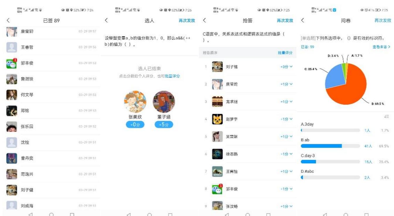 然后是课堂知识内化:聚焦学生课前预习过程中的难点问题,有针对性地开展教学活动;就重要的知识点与学生互动。课程设有签到、选人、抢答、问卷等近100个互动活动,分散在每次课的重要知识点(图10)。教师可以第一时间掌握学生的出勤情况、对课程的参与程度和知识掌握的熟练情况,以便及时对教学计划和教学方案进行调整。