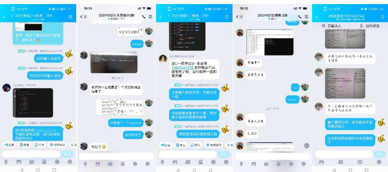 《C++程序设计》线上教学团队朱颖芳、黄慧华、李湘华老师提到,程序设计类课程教学痛点在于语法、代码繁多,课堂讲解需要生动化。面对线上教学,他们采用了方便屏幕切换共享的腾讯课堂,一边讲解代码一边运行程序,让学生身临其境,无异于线下课堂。另外学生的课堂接受能力有限,很多知识需要课后通过回顾和实验去理解和消化,如果在这个过程当中出现问题不能及时找到解决的办法,就会慢慢失去兴趣。