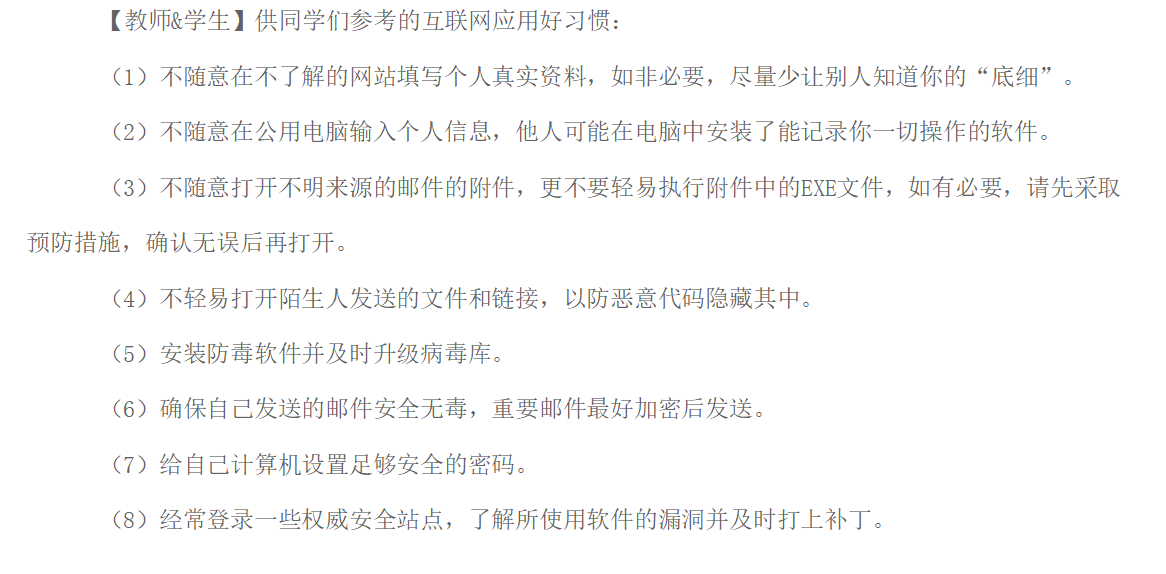 从实际举例出发,激起学生的兴趣和共鸣,再回到理论的学习与指导,然后在理论的基础上再次回到实践操作上来,真正让学生对计算机信息安全由感性认识到理性认知的一个转变。课堂大量使用真实案例,和实际操作,让学生对计算机信息防护有一个实质的理解和防控,而不仅仅停留在书本知识上,通过操作大大增强了学生的安全防护意识和操作技能,对书本知识有一个更加深刻的理解,规范自己的网络行为,从而提高自己的网络素养。